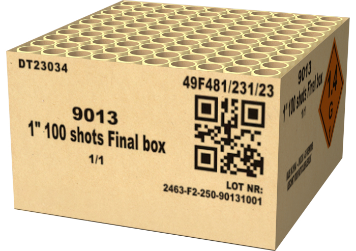 100 schoten in een razendsnel tempo afgevuurd! Blauw en goud, gecombineerd met grote chrysanthemum mines en chrysanthemum effecten.
