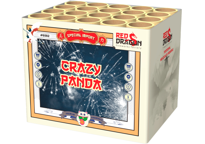 Klein maar fijn, dat is de Crazy Panda. 20 schoten met rode, groene, paarse en gele sterren gecombineerd met heftige crackling.