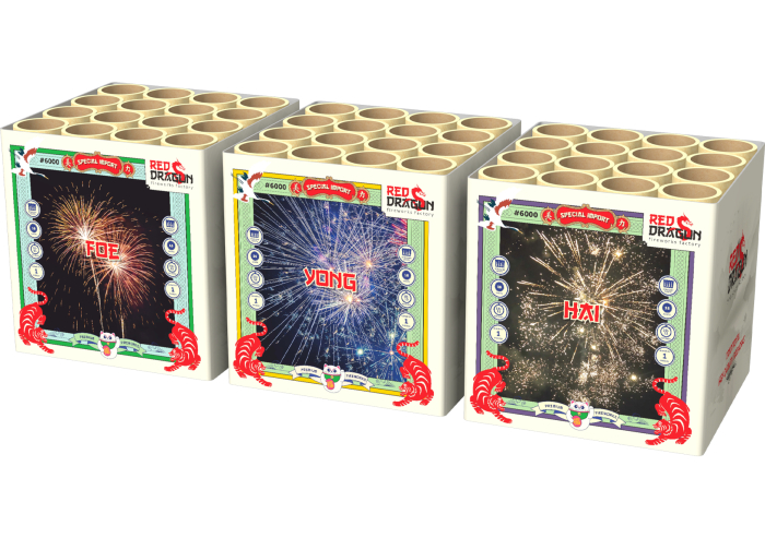 Een 3-tal sierlijke cakes met ieder 16 schoten schieten een diversiteit aan kleurrijke effecten tot grote hoogte de lucht in. Denk hierbij aan: Crackling, multicolor, palm-effecten en nog veel meer! 2+1 gratis! Je koopt de Foe en Yong en je krijgt de Hai er GRATIS bij!