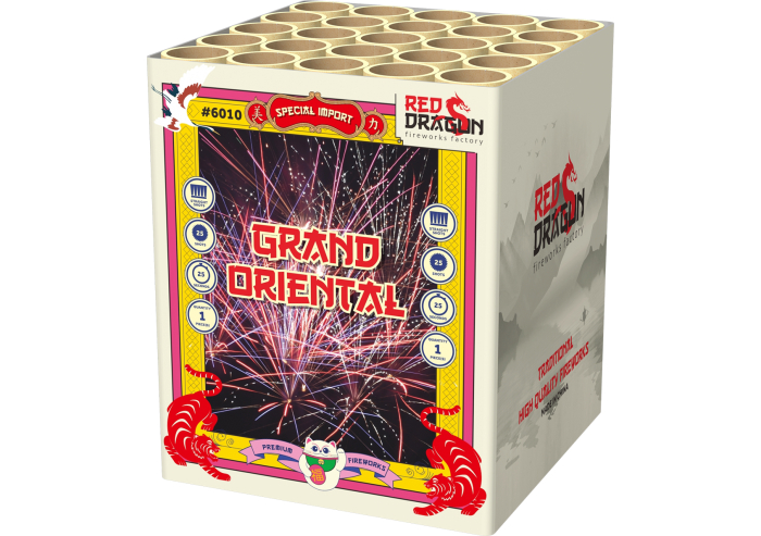 Glitterende willow effecten, dat is waar de Grand Oriental voor staat! Met een felle glittering staart worden alle 25 schoten de lucht in gelanceerd, uiteenspattend in spectaculaire glitterende willows!