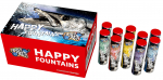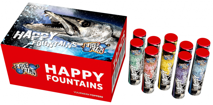 Tien kleine fonteintjes die rode, gele, blauwe, paarse en groene sterren de lucht in spuiten. Voor fonteinen van dit formaat een verrassend grote uitwerking!