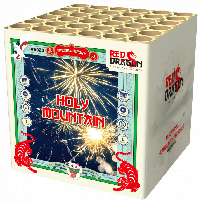 Maar liefst 36 schoten, maximaal gevuld met 500 GRAM kruit! De Holy Mountain is écht voor de liefhebber van knettereffecten. Heftige crackling mijnen gevolgd door kleurrijke dahlia’s met crackling. Een ware crackling sensatie!