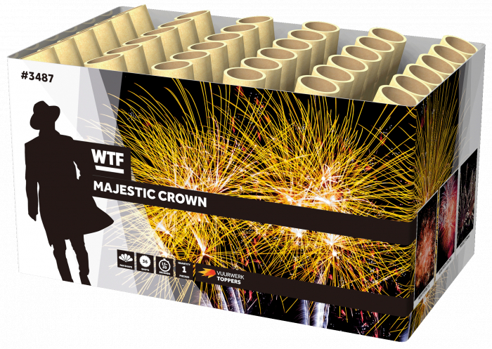 Alweer zo'n prachtige 36 schots waaiercake van 500 GRAM! De Majestic crown vuurt afwisselend rechts en links en in het midden af. Daardoor ontstaat er een extra breed effect in de lucht. De waaiercake cake wisselt wit en goud glitter, gouden staarten en brocade crown effecten af.