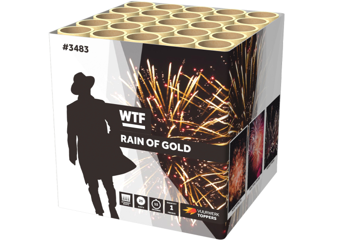 Goudgekleurde mijnen worden opgevolgd door gouden glitter, blauwe, paarse, gele en rode sterren en eindigen in een ongekende finale! De 25 schoten in deze cake worden in een spectaculair salvo afgevuurd!