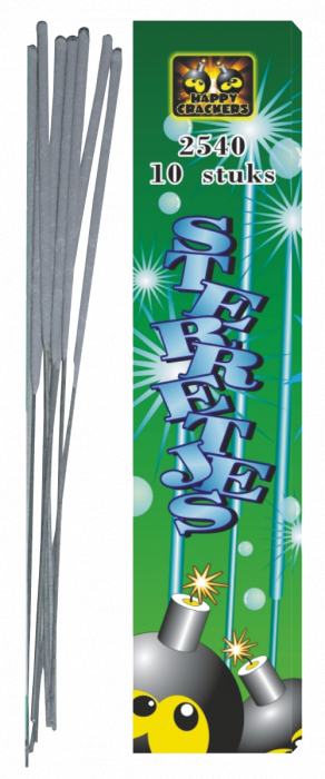 Werkelijk iedereen kent ze: de sterretjes. Ze geven felle witte vonken. Leuk om bijvoorbeeld een taart mee te versieren. Deze zijn per 10 verpakt en zijn 16 centimeter lang. Al onze producten hebben het CE Keurmerk en zijn daarmee veilig. Kinderen mogen dit product gebruiken. Dit is een product van Happy Crackers, gespecialiseerd in vuurwerk voor het hele gezin. Op de merkenpagina vindt u het hele assortiment. Kijk ook nog even naar de video van Pyro Piet over het gebruik van dit product.