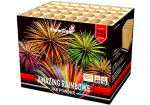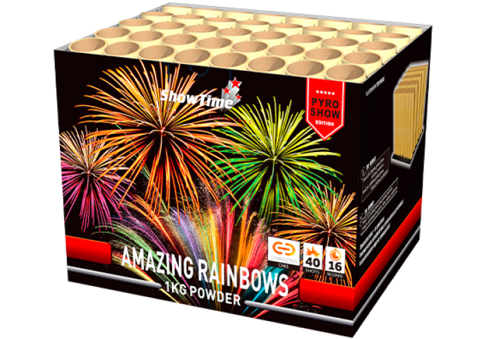 Een regenboog aan kleuren schiet de Amazing Rainbows hoog de lucht in. Rainbow mines met daarboven rainbow dahlia effecten. Maar liefst 40 schoten, 1 KG kruit en maar 1x aansteken! Dankzij de waaiervorm creëert deze cake een extra breed effect in de lucht! Misschien vind je nog wel een pot met goud aan het eind van de regenboog..