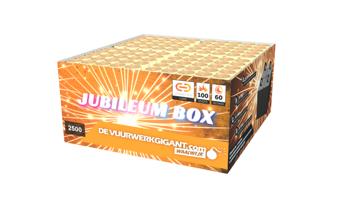 FEEST!! Deze jubileum box hebben we voor jullie in China samengesteld, voor ons 25 jarig jubileum. Deze 100 shots hoog tempo compound, geeft je nieuwjaarsnacht een ongekend spektakel met enorme chrysanthemum mines en bijzondere effecten! Met een gouden tint!